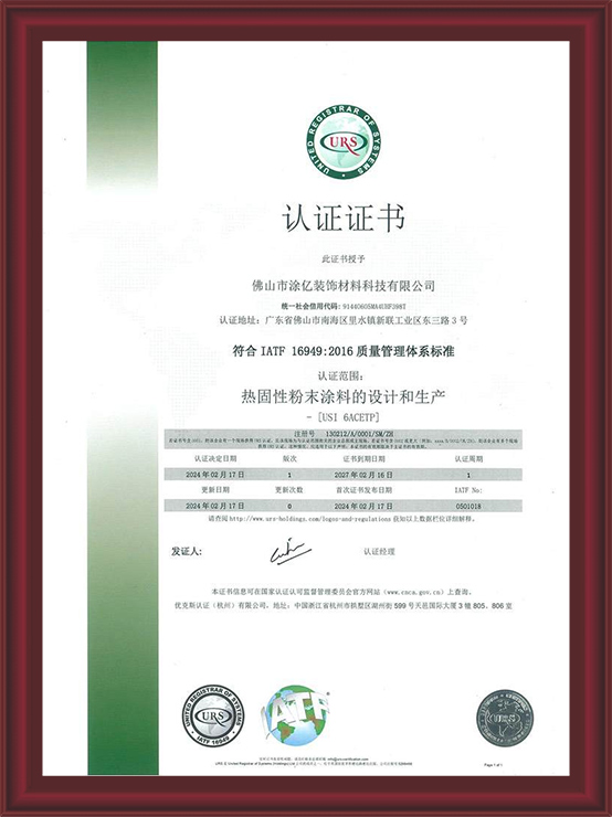 IATF 16949:2016 質(zhì)量管理體系標準(熱固性粉末涂料的設(shè)計和生產(chǎn))